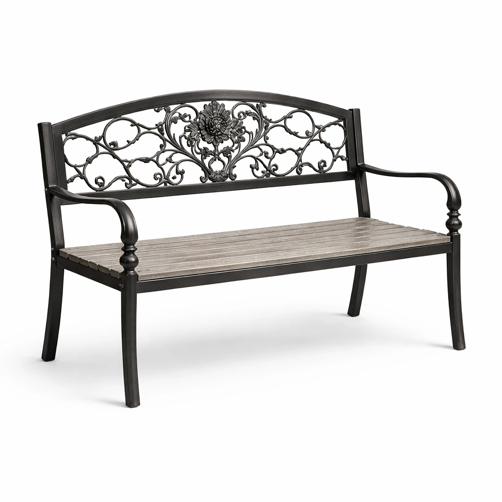 Die Bank bietet Platz für 2 Personen mit einer Tragfähigkeit von bis zu 200 kg. Das Blumenmuster und die pulverbeschichtete Oberfläche tragen zur Langlebigkeit und Ästhetik bei.